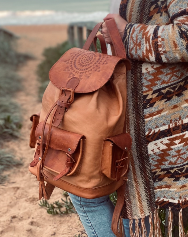 Our handmade leather backpack is perfect for everyday, beach, hiking, and shopping. Made with a super soft leather, two adjustable straps and a top carry handle. I also love the hand tooled design on the top, makes the backpack very unique.