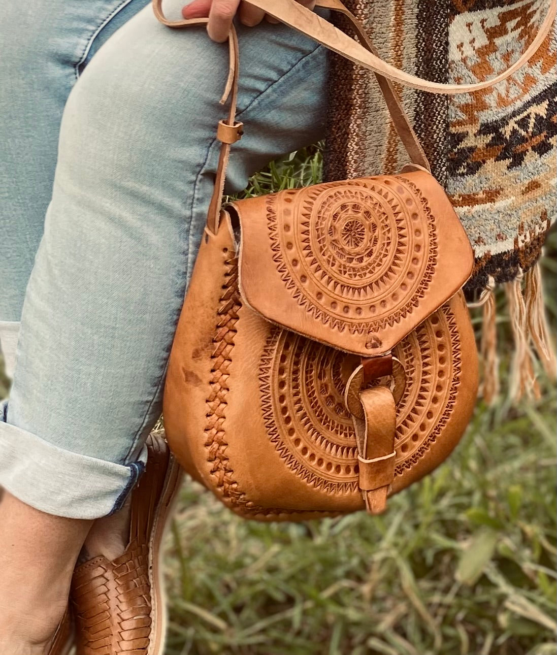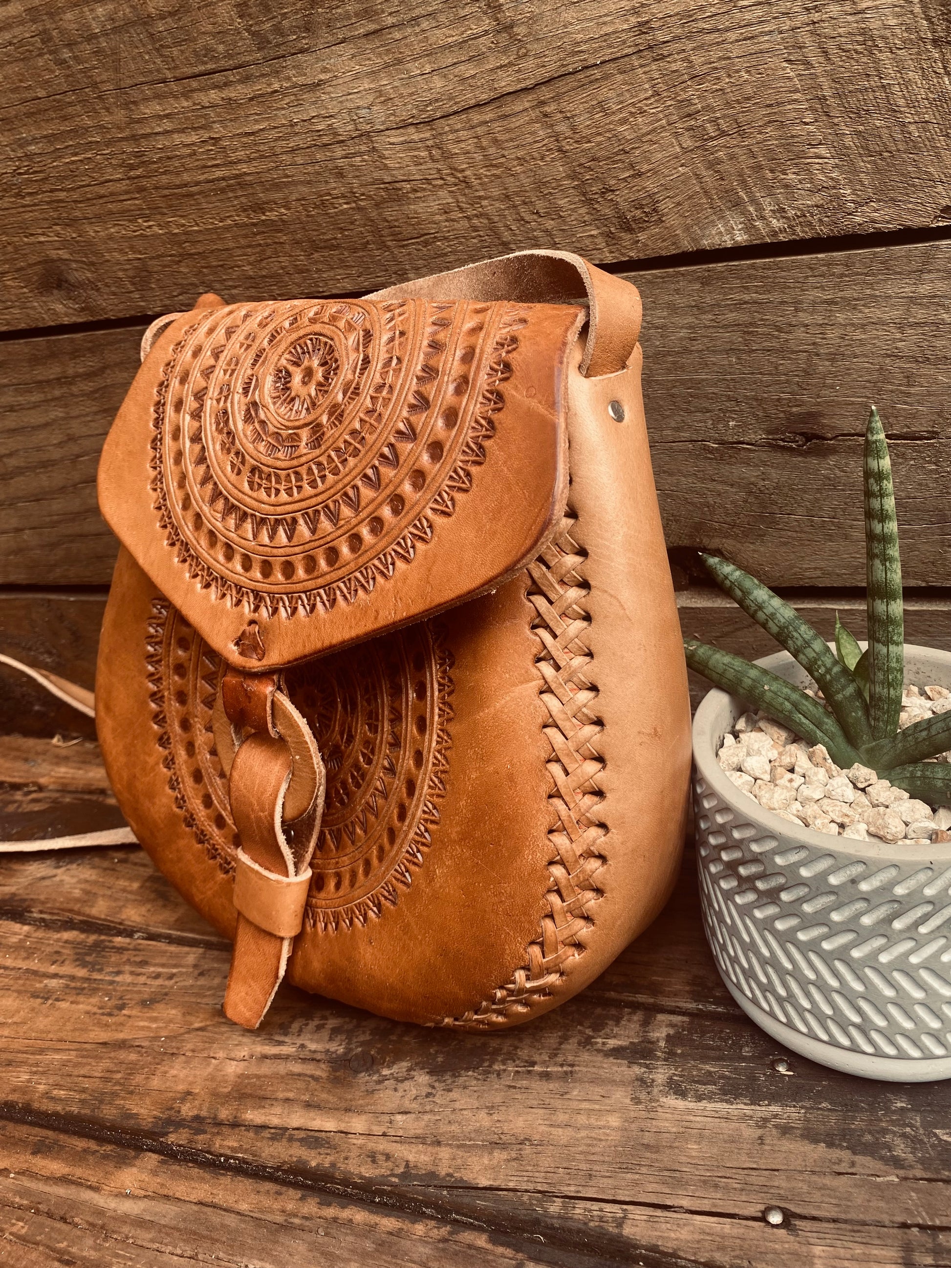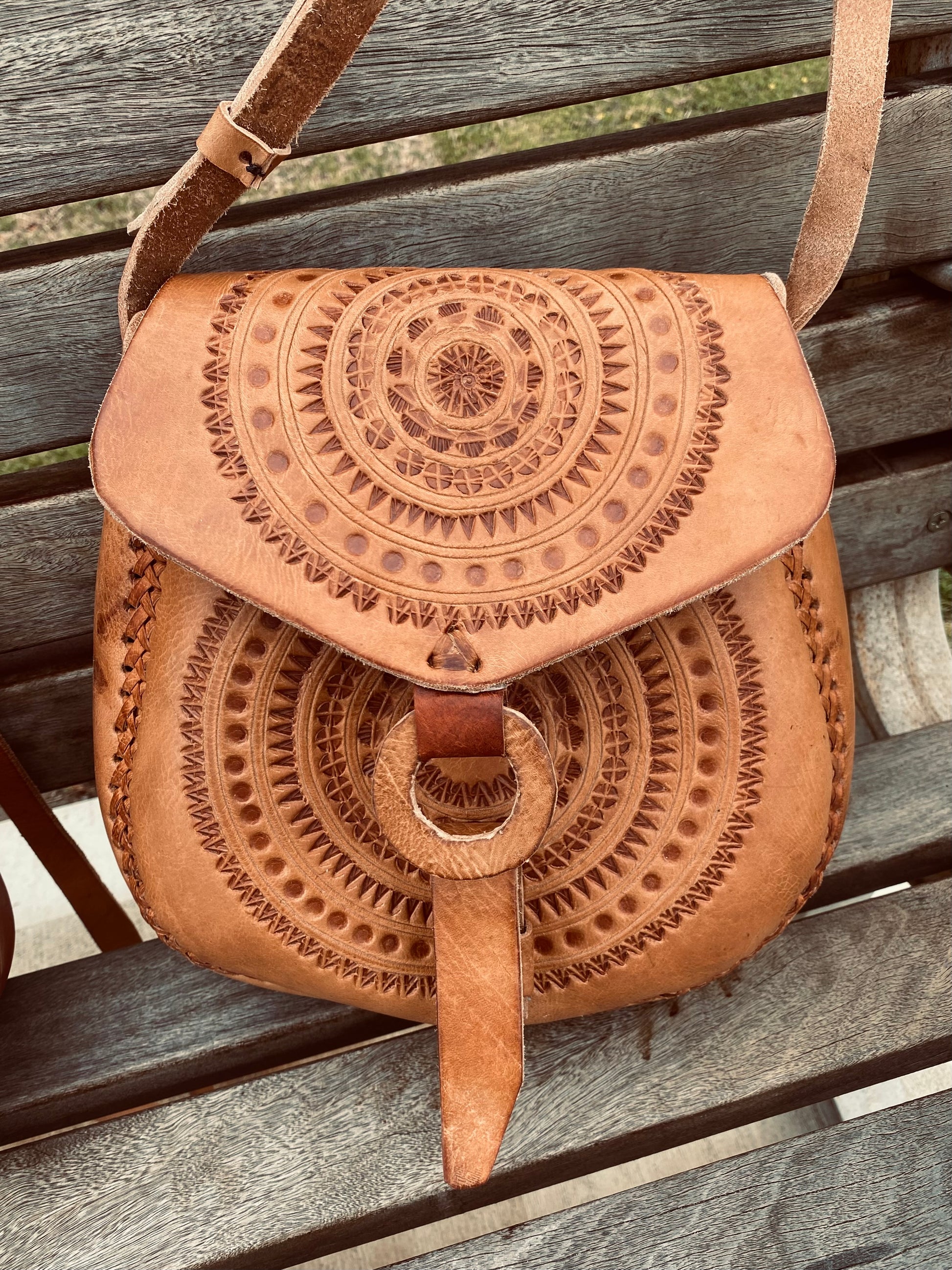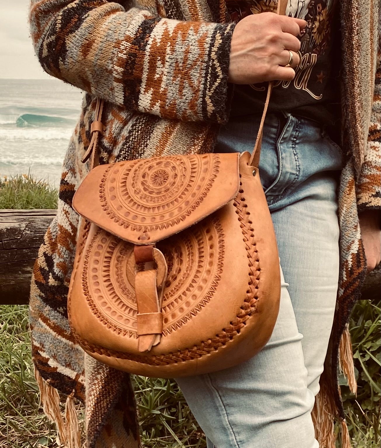 This beautiful hand tooled leather bag is one of our most loved bags. A great everyday bag that keeps its shape so well, due to the thick leather and the beautiful hand stitching around the edges