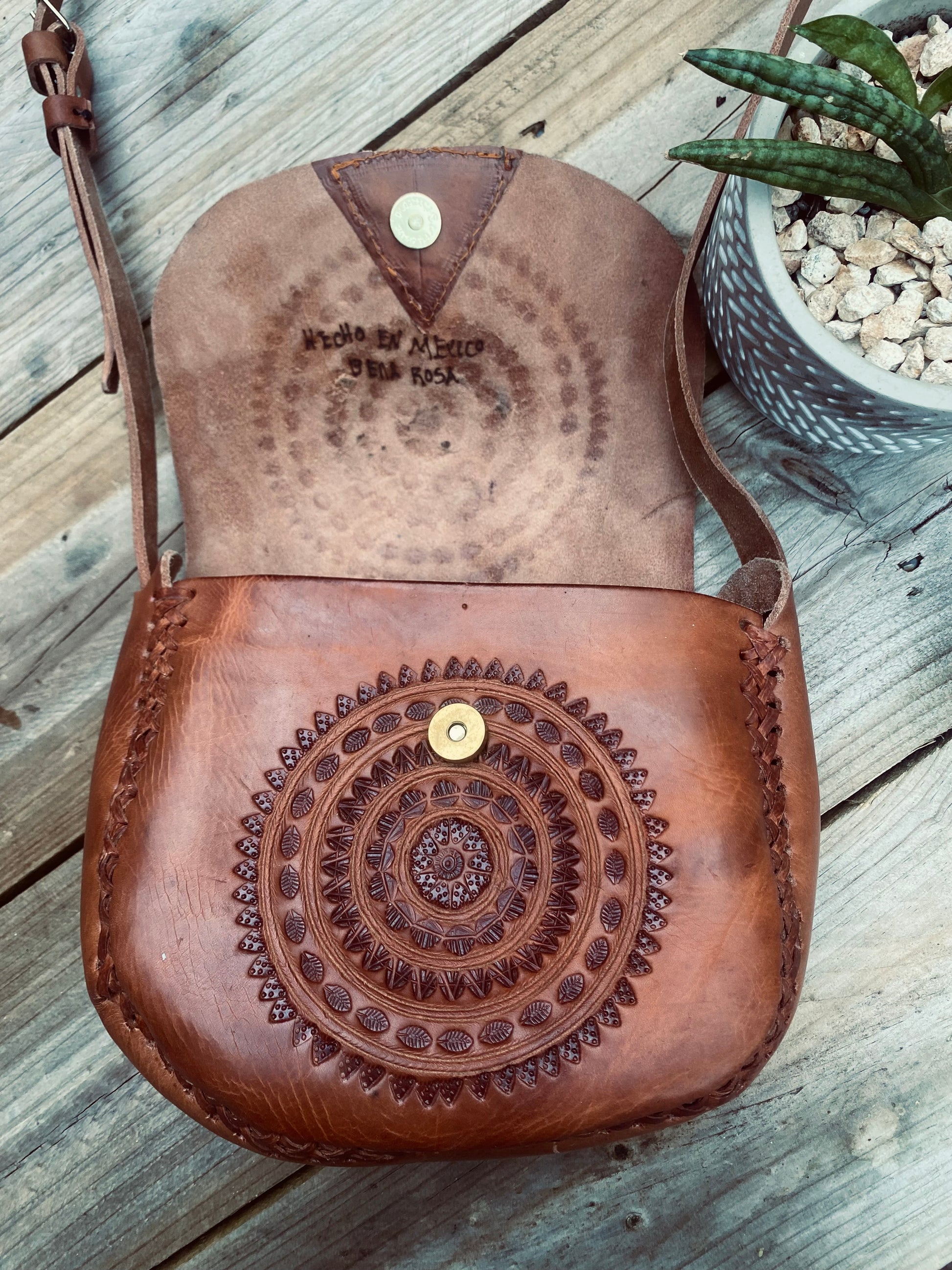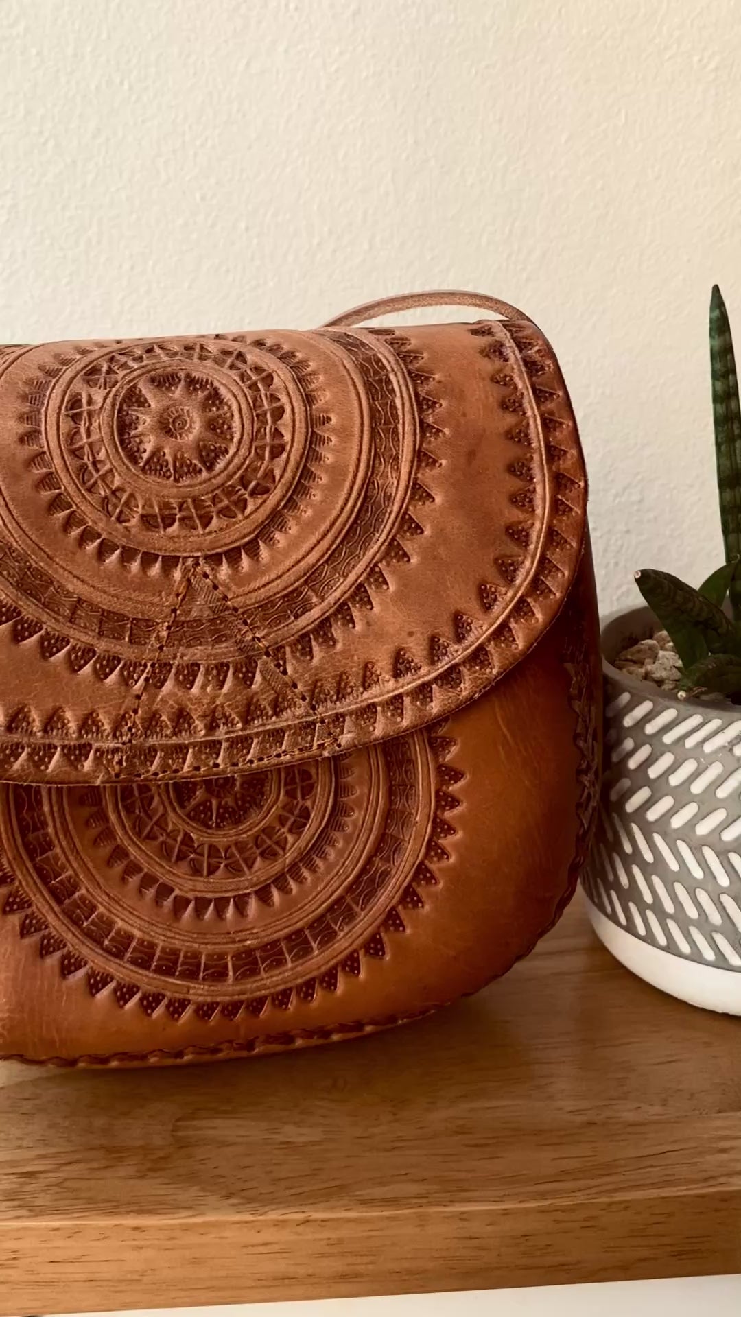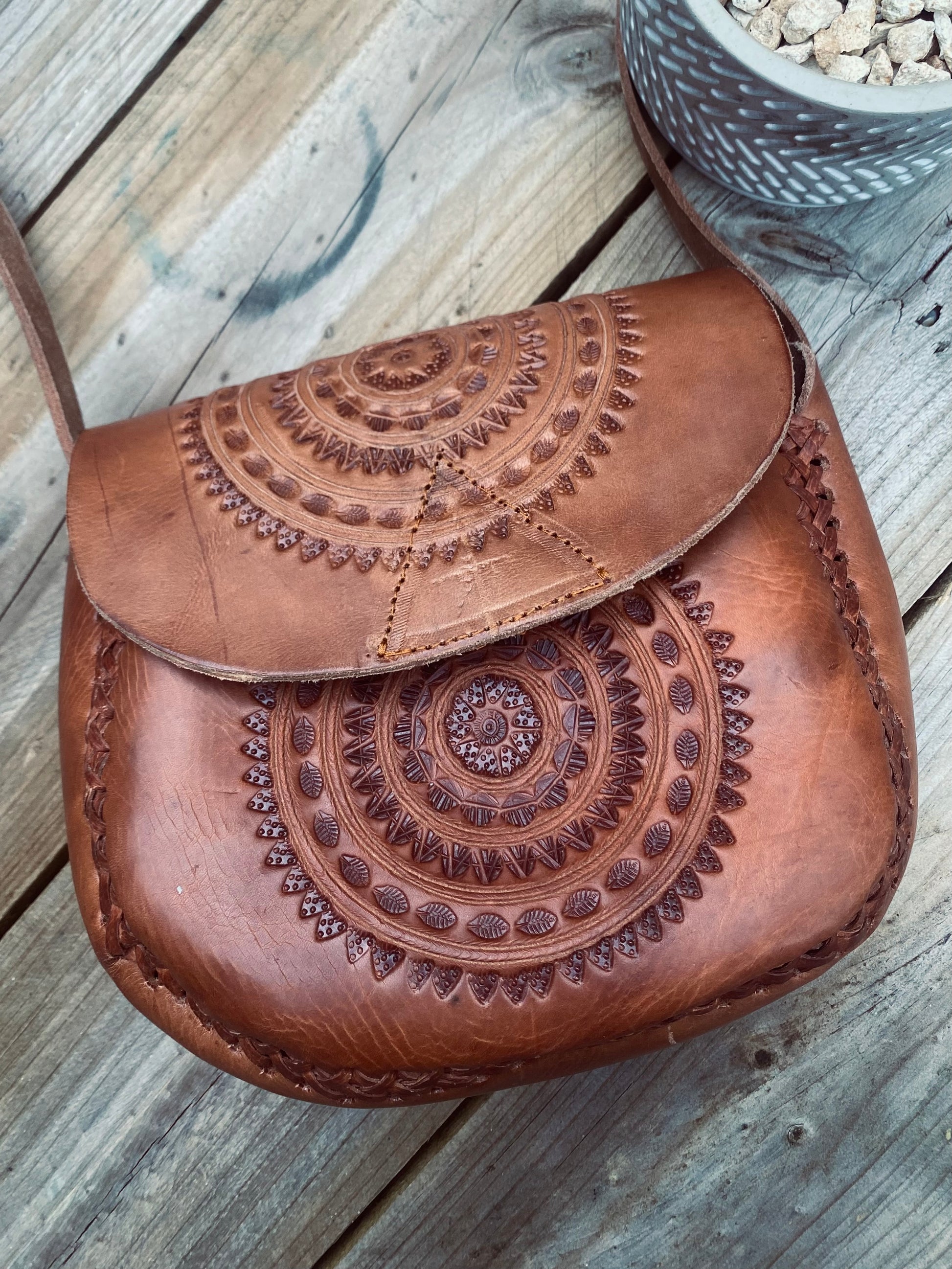This boho bag is beautifully shaped and has a lovely hand tooled design on the outside and the front of the bag.