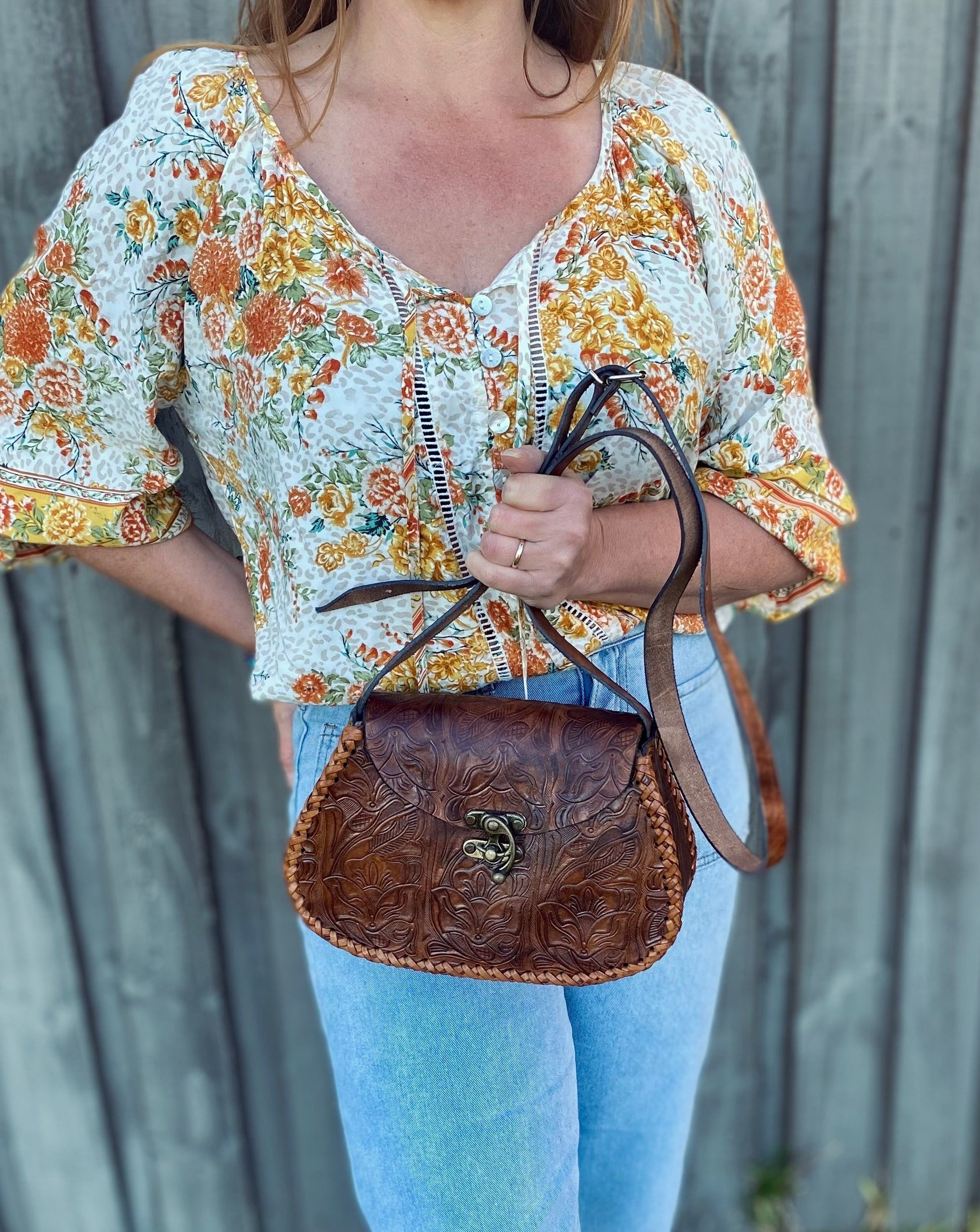This lovely brown leather bag, has the tooled design all over and the lighter brown leather stitching around the edges.