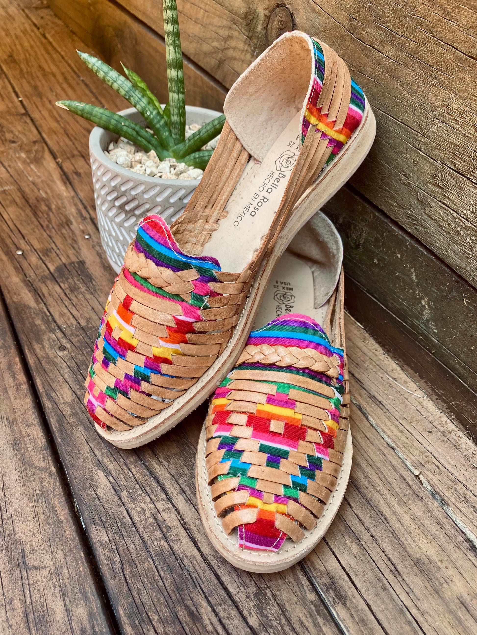 Crafted from vegetable-tanned leather and vibrant rainbow material, these Mexicali Huaraches are the perfect way to bring a unique touch of colour to your style. Show off your individuality with these one-of-a-kind huaraches.