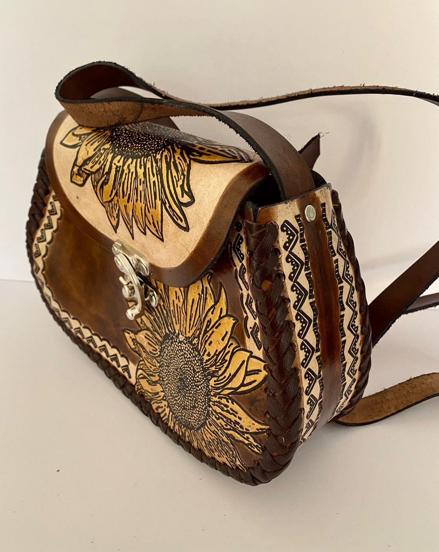 This unique Perla bag is hand-painted with sunflowers, making it truly one of a kind. With its vintage latch and Mexican-made hand-painted leather, you can carry your style with you wherever you go. Let your individuality bloom!