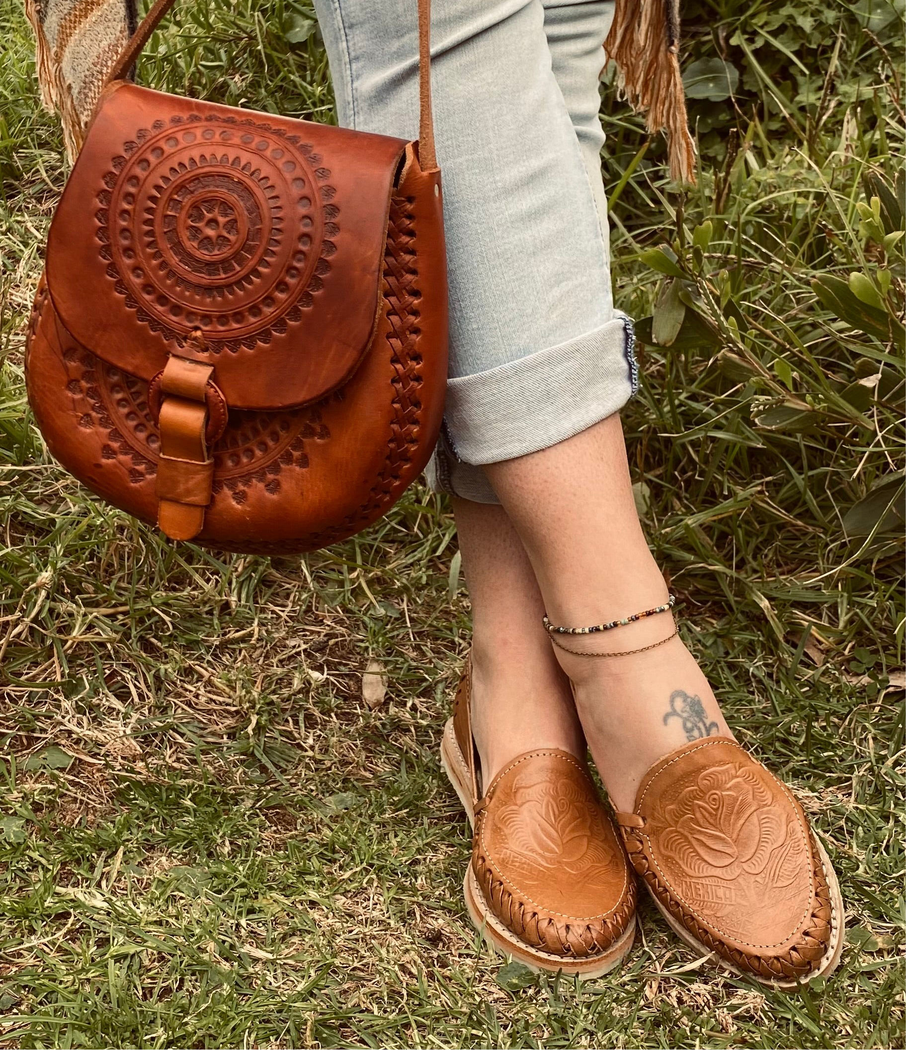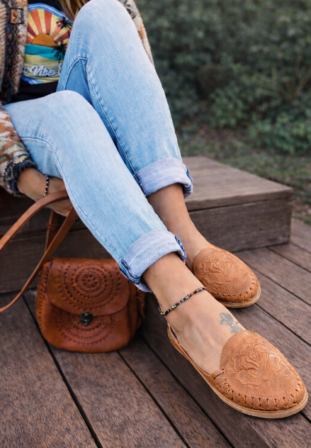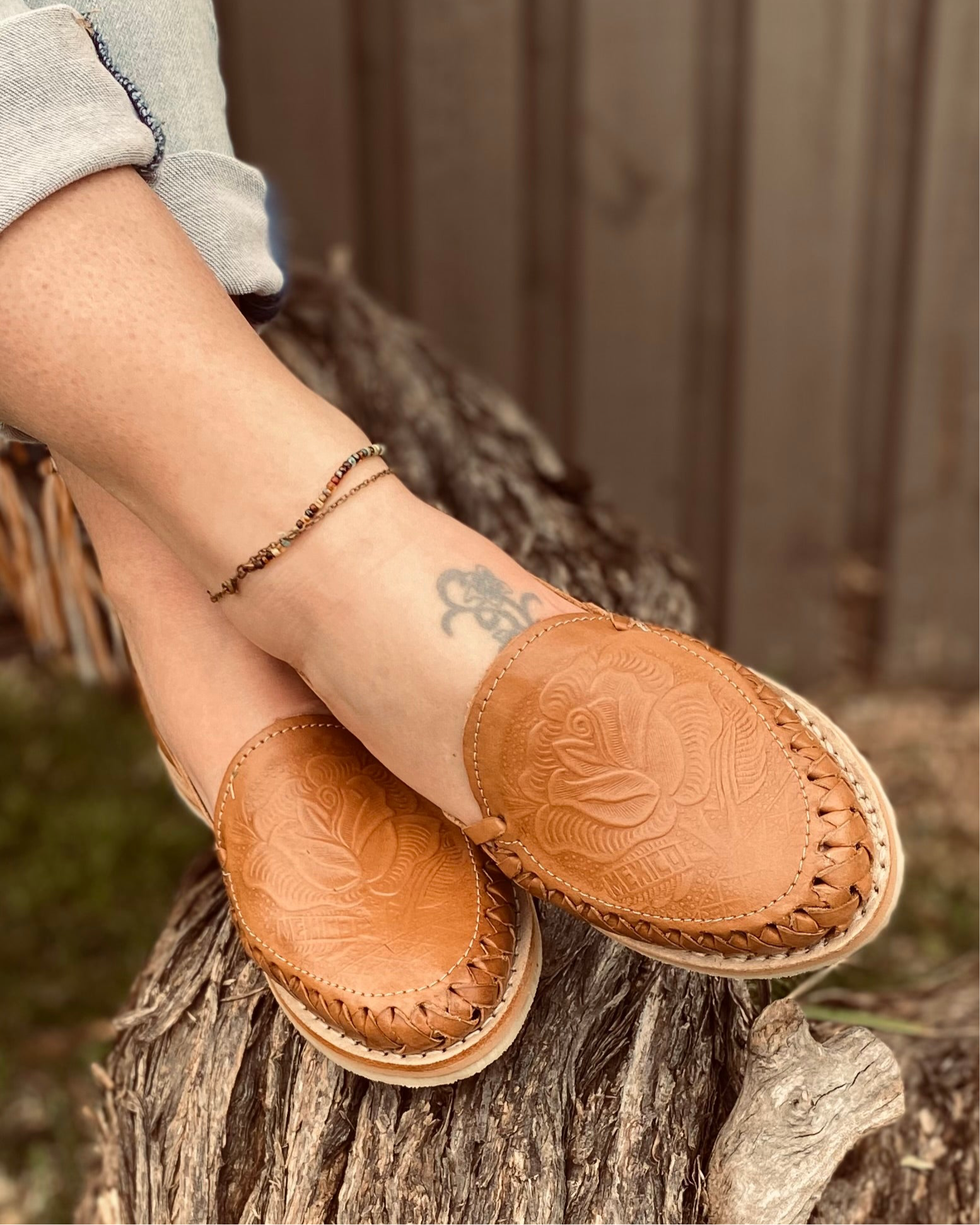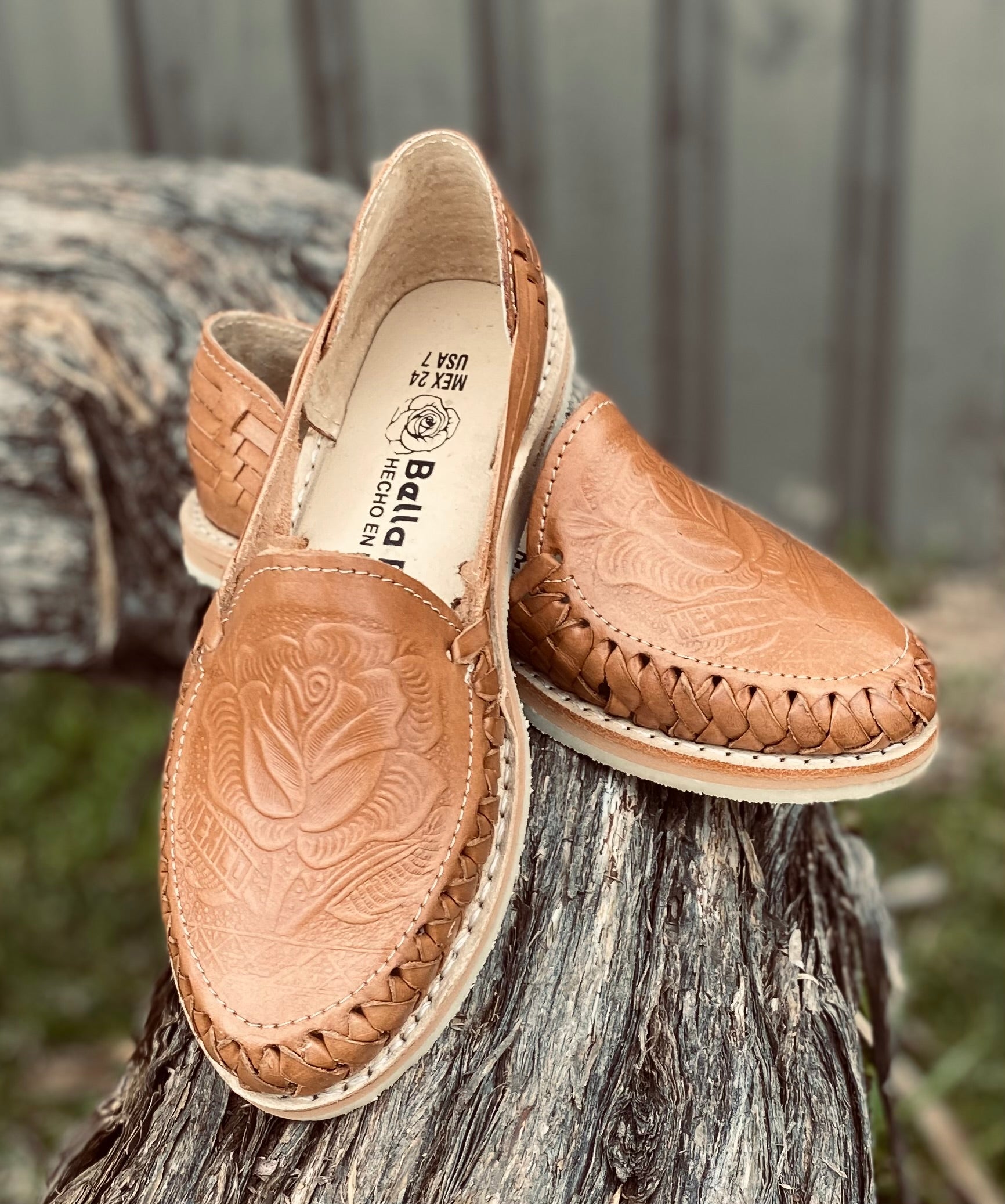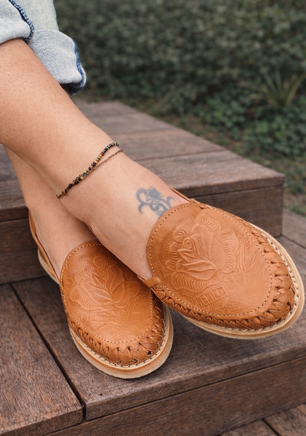 A stunning tan sandal, with the Rose design on the front. It also says the word Mexico near the rose. This huarache looks amazing with jeans and a floaty dress, so versatile and comfortable.