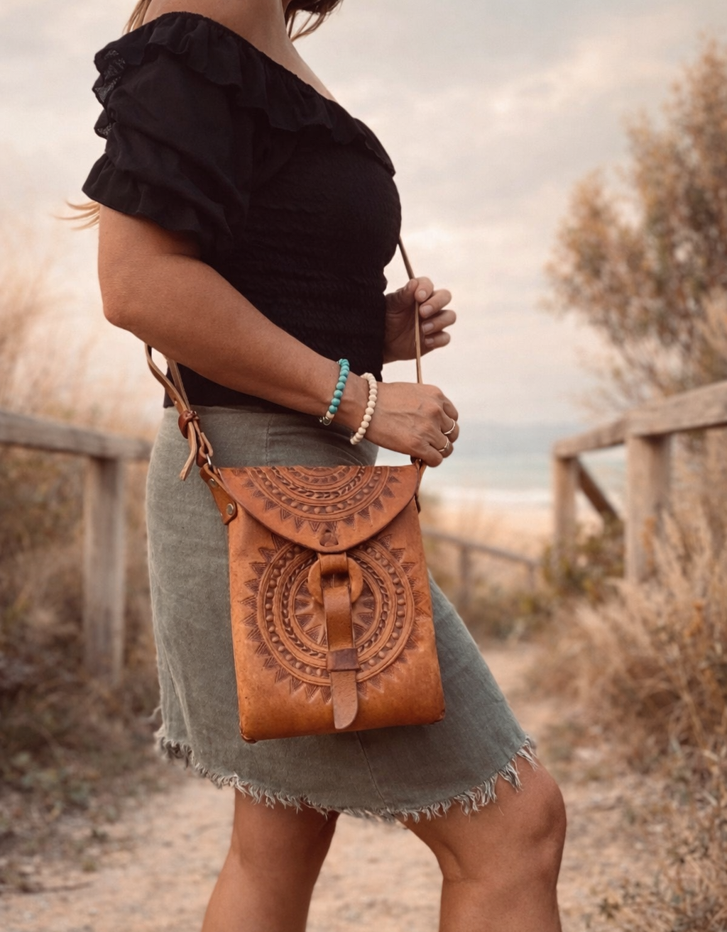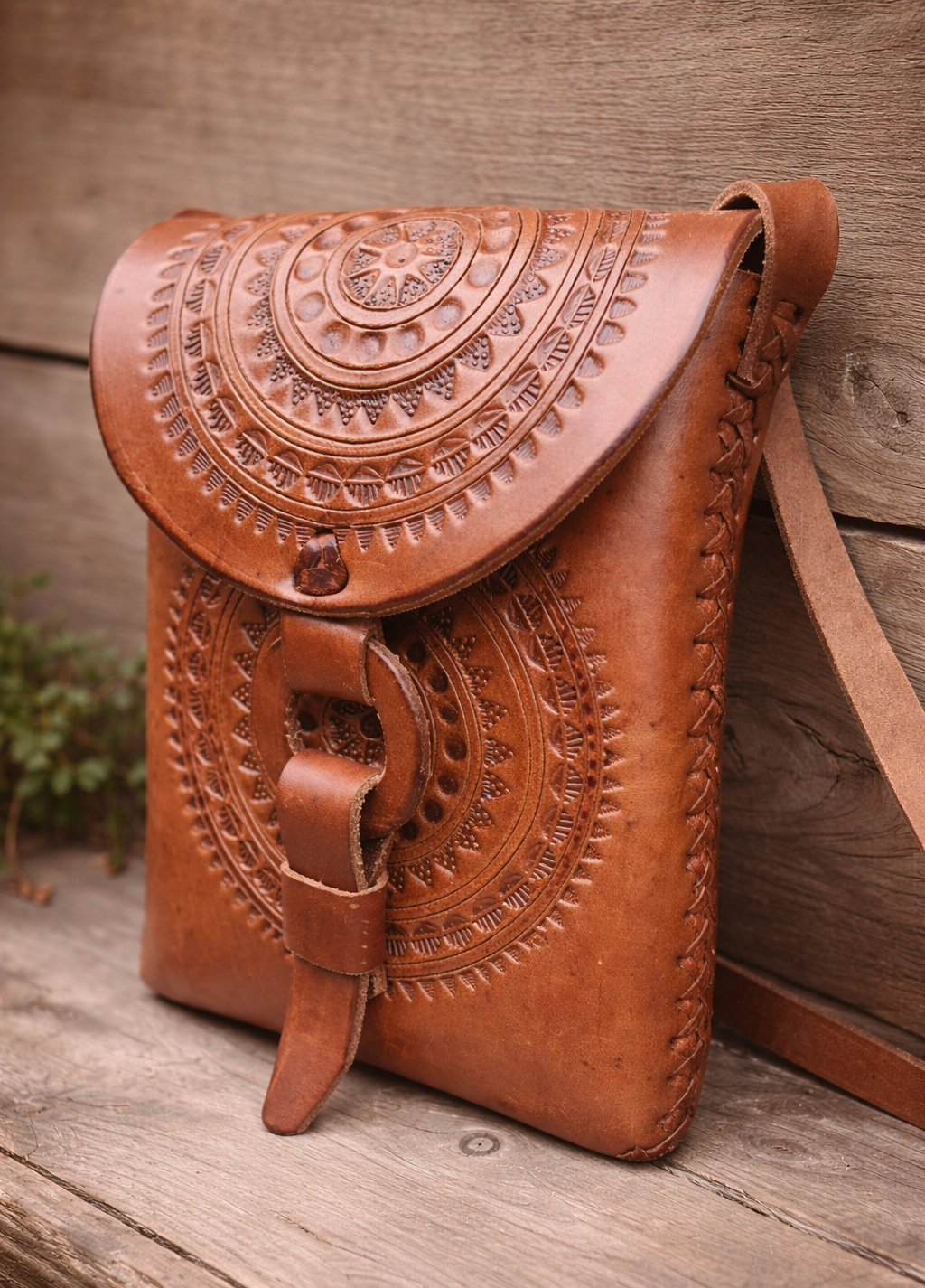 This handmade leather bag is beautiful with the Mayan Sol design on the front. Made in thick durable leather, and with the hand stitching down the side.