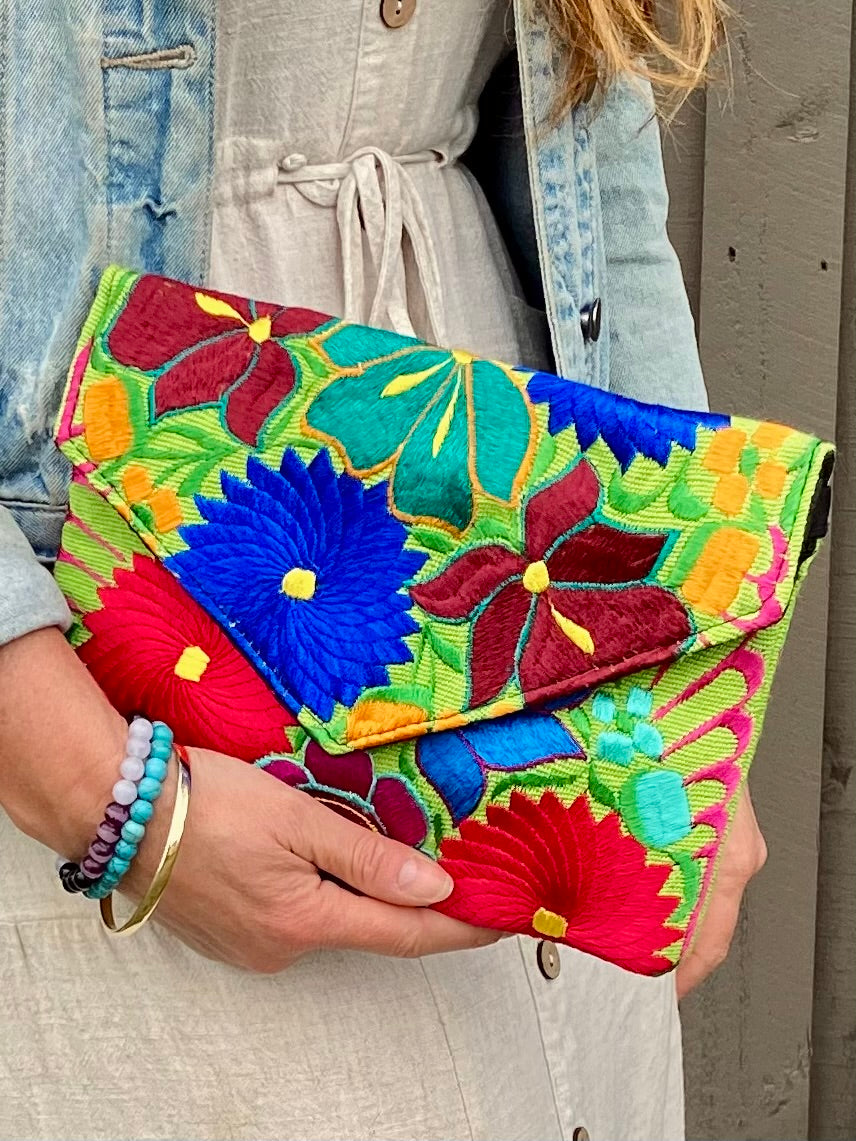 These stunning bright colour clutch bags are embroidered in the same Mayan community in Chamula and the design is on on the front and the back. Lined on the inside and has a long material strap or you can tuck in to create a beautiful clutch bag.